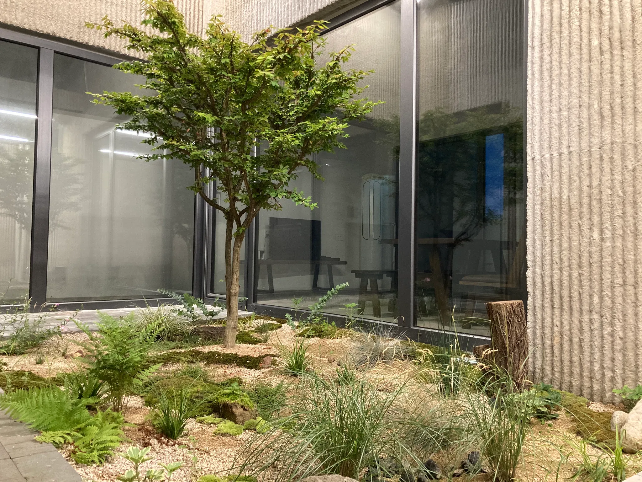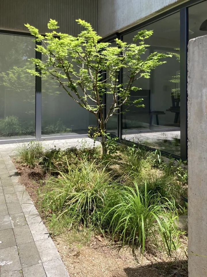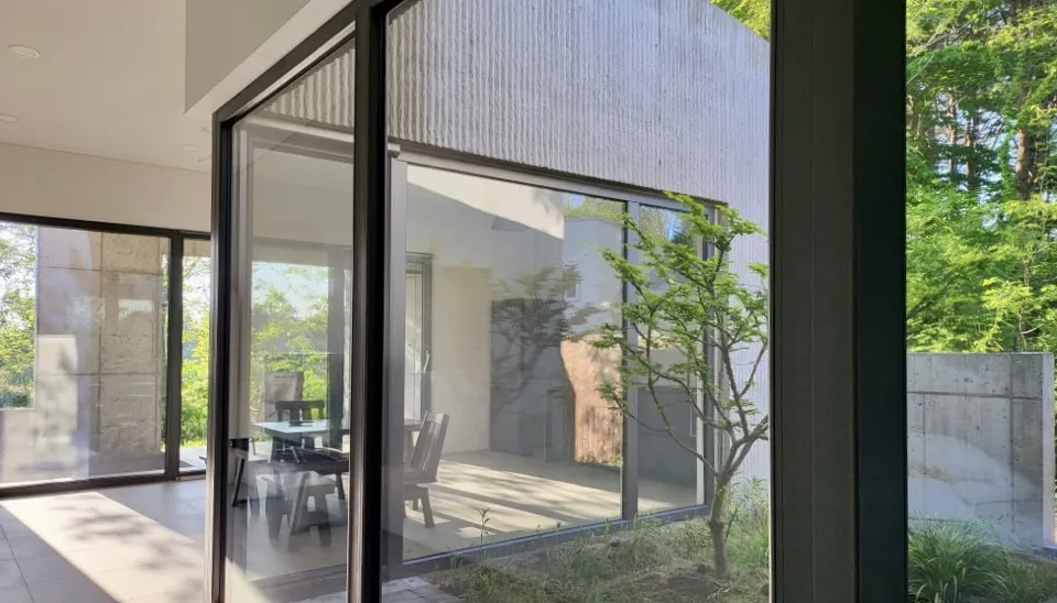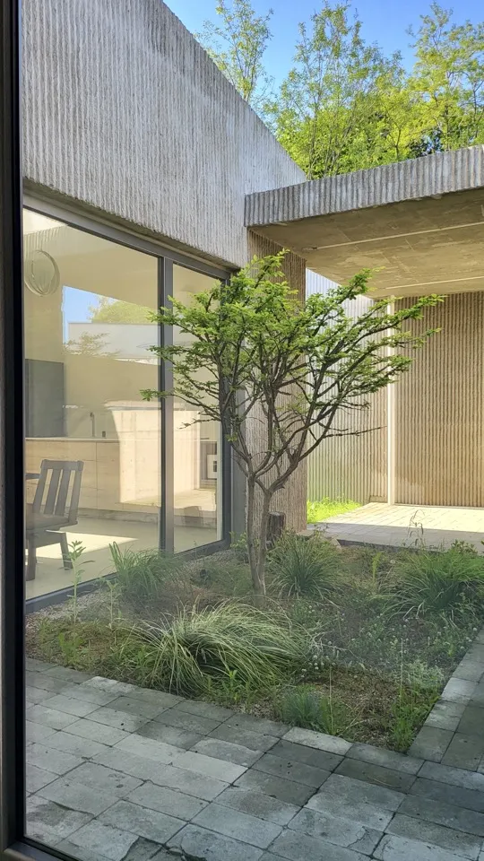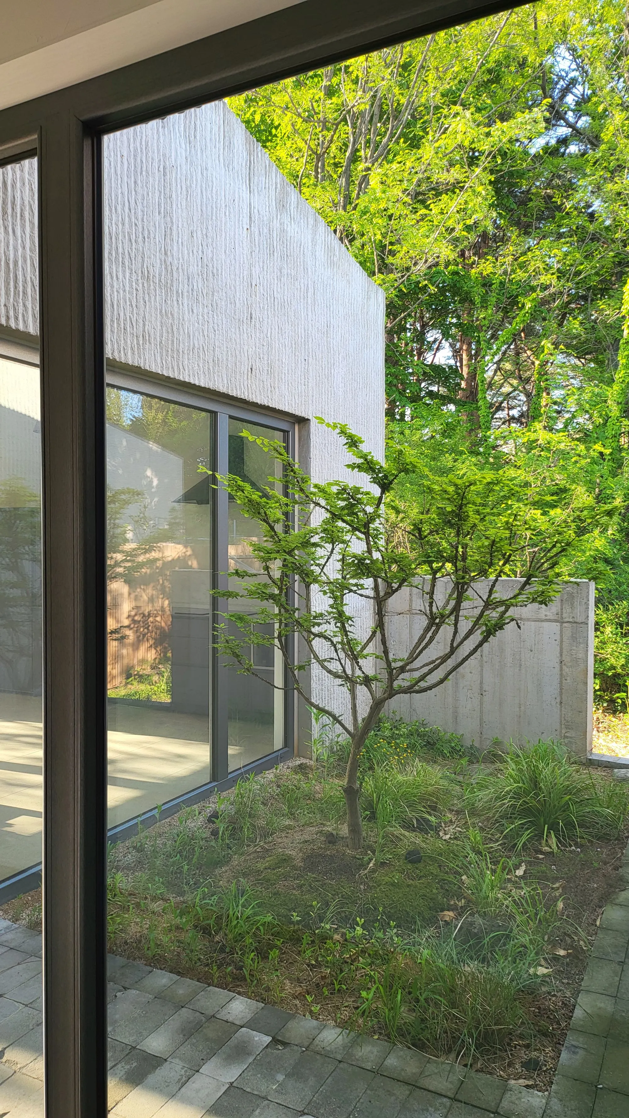 주방가구는 진한 먹색이고, 주방벽은 회색이에요. 마당 넓이는 세 집 중에서 중간이고, 중정에 지붕있는 공간이 없지만 더 많은 나무를 가까이 하고 있어요. 실외공간을 제외한 실내면적이 58.85입니다.