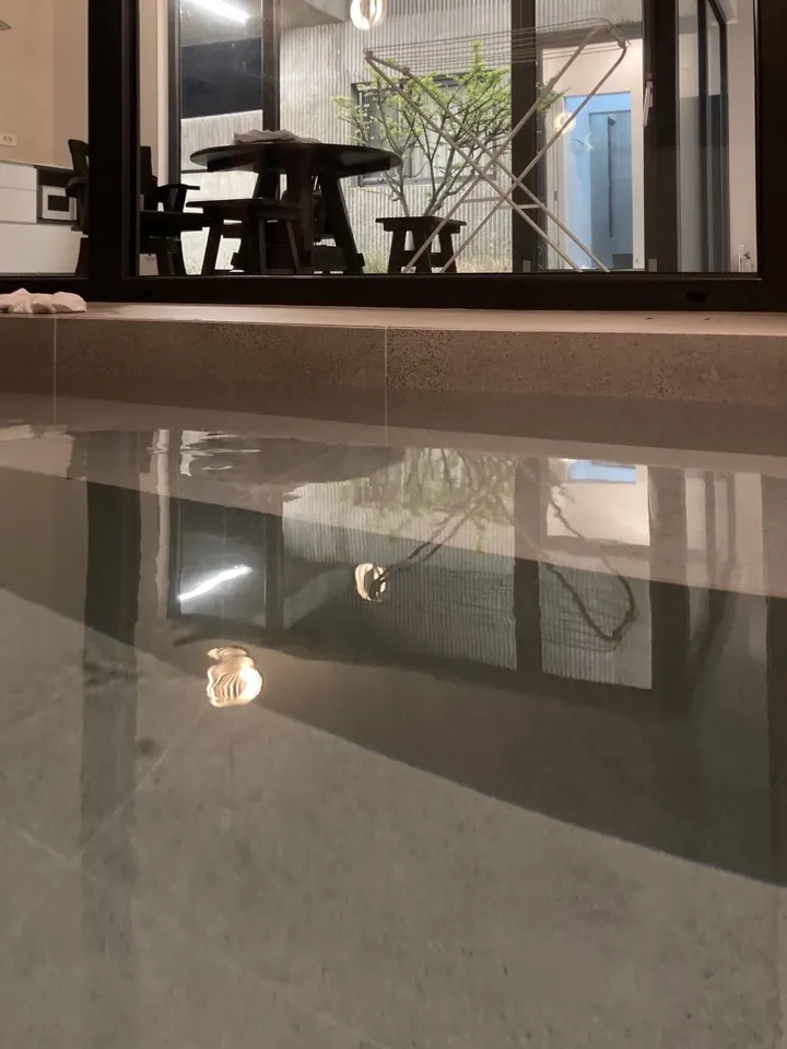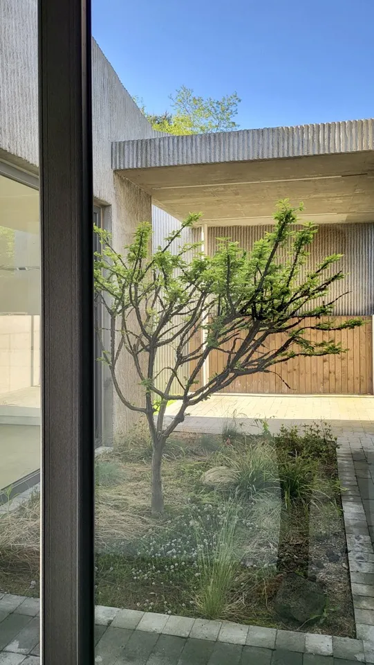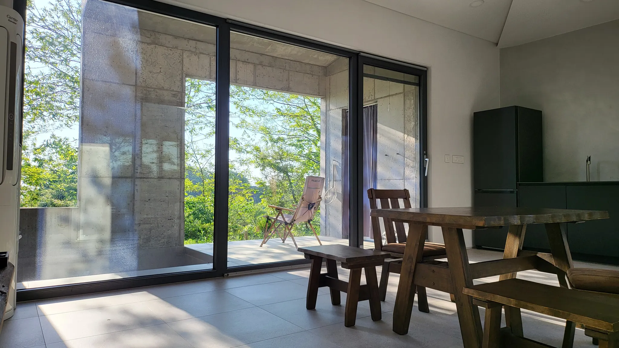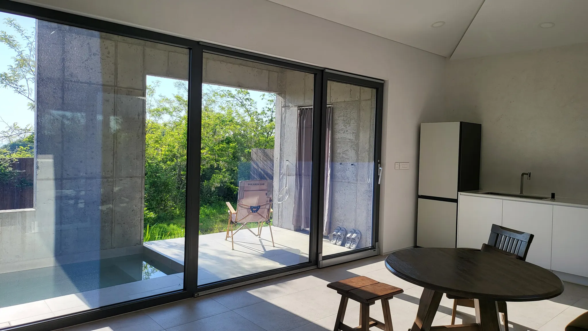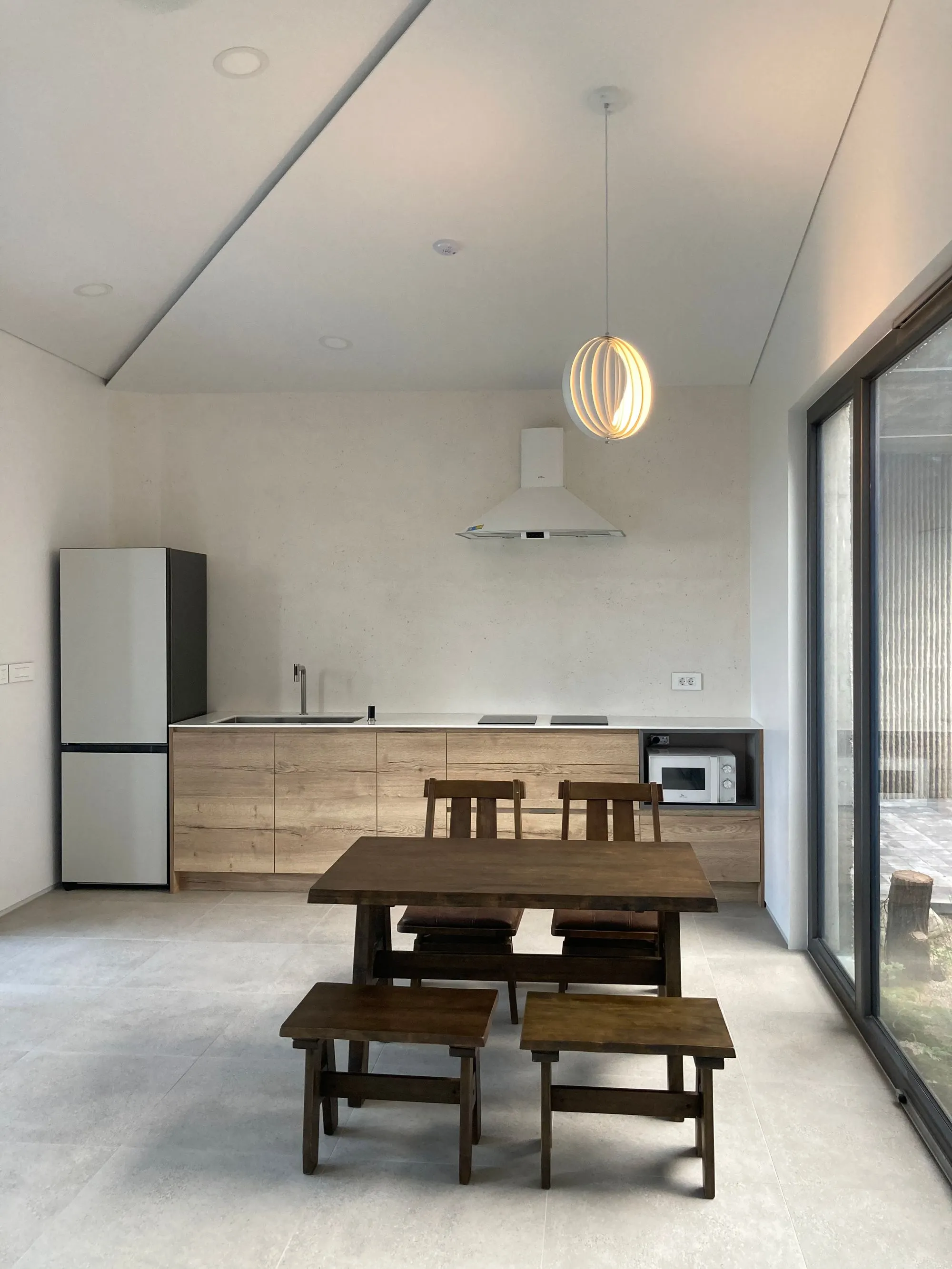 주방가구는 나무색이고 주방벽은 아이보리 톤이에요. 마당이 세 집 중에서 가장 넓고, 중정에 지붕있는 공간이 있어요. 실외공간을 제외한 실내면적이 58.85입니다.