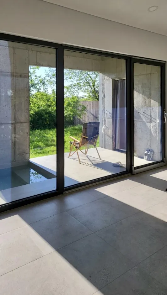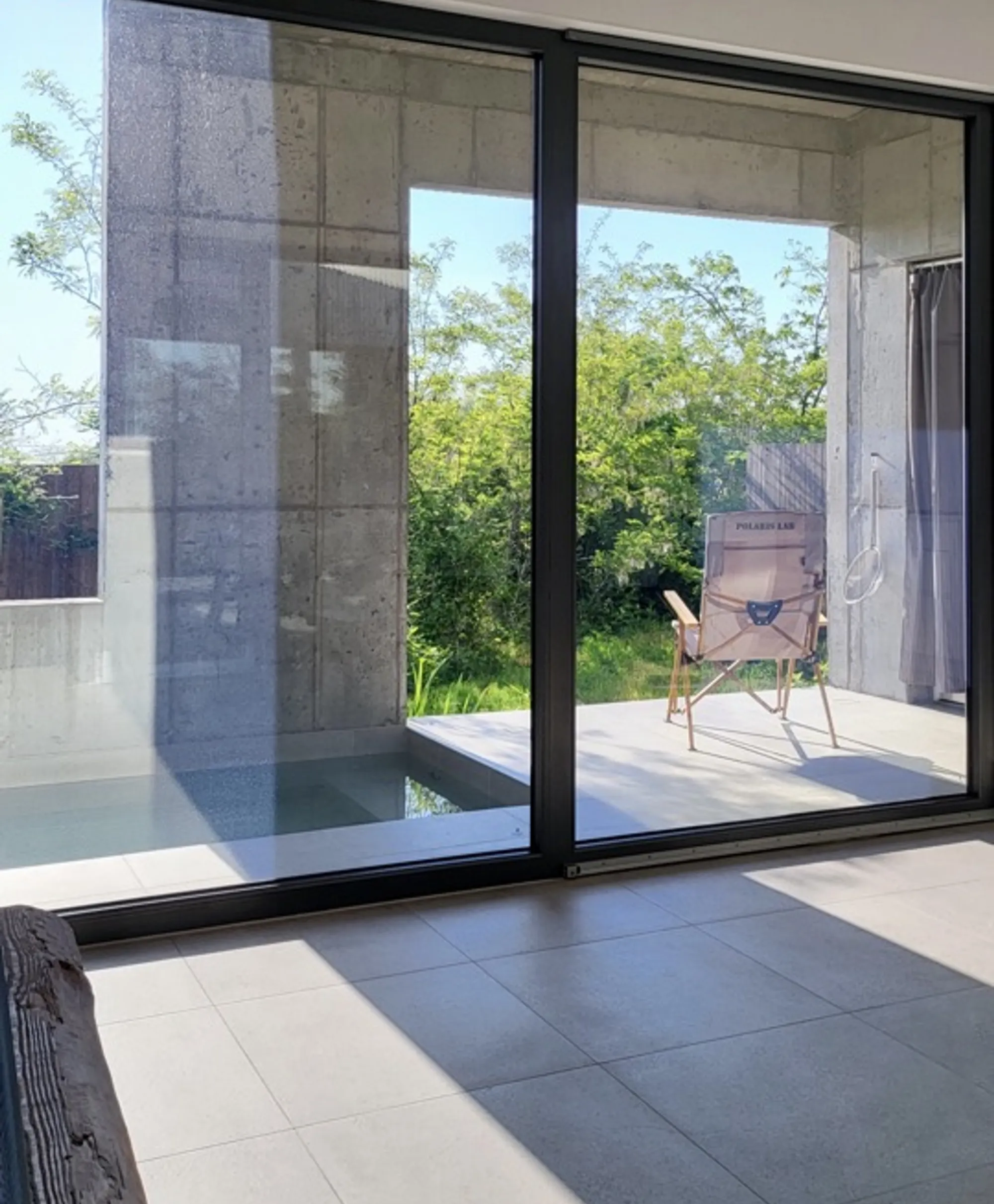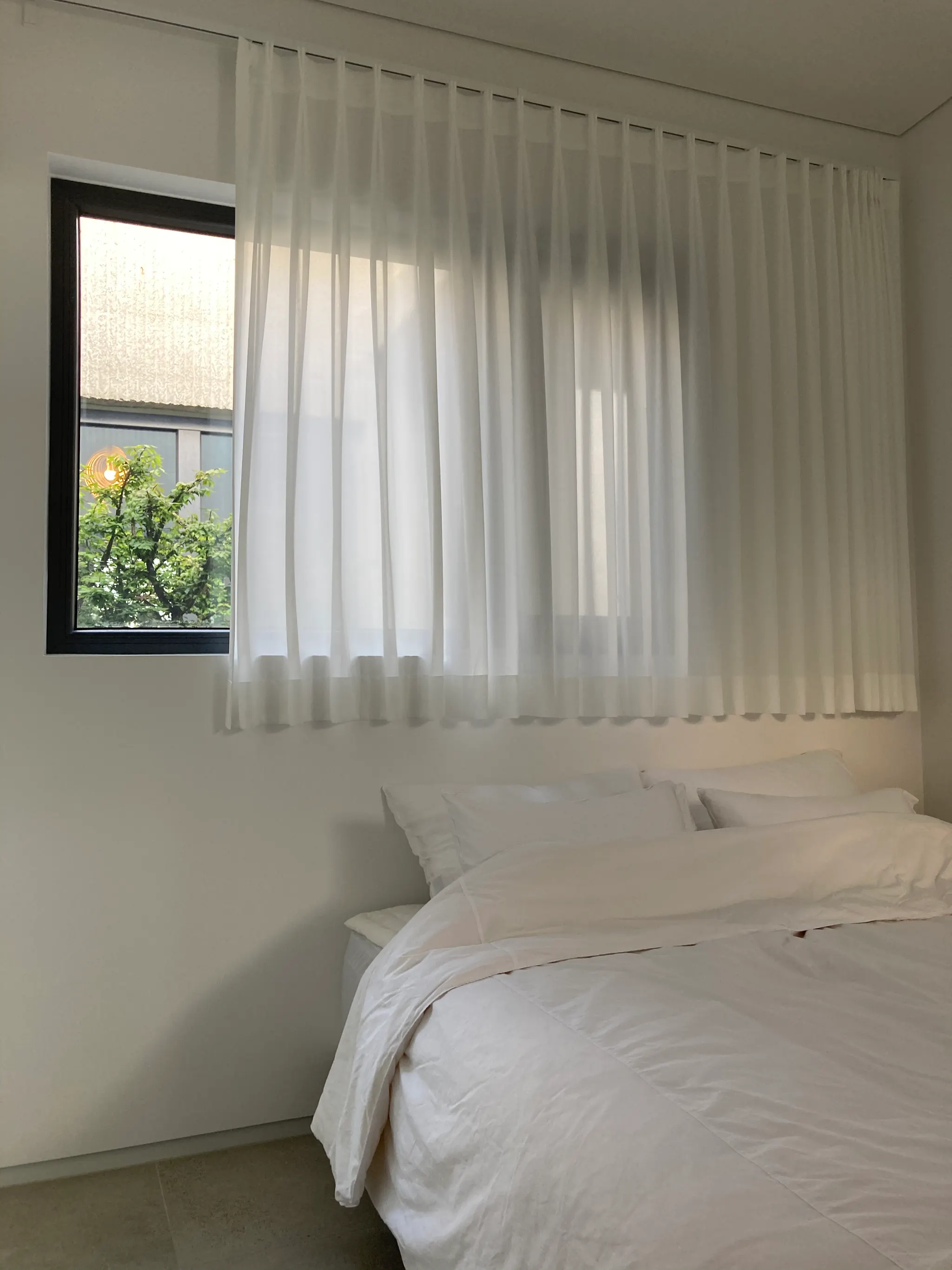 주방가구와 주방벽이 전체적으로 하얀색이고, 마당이 가장 좁은편이지만, 중정에 지붕있는 공간이 있어요. 실외공간을 제외한 실내면적이 58.85입니다.